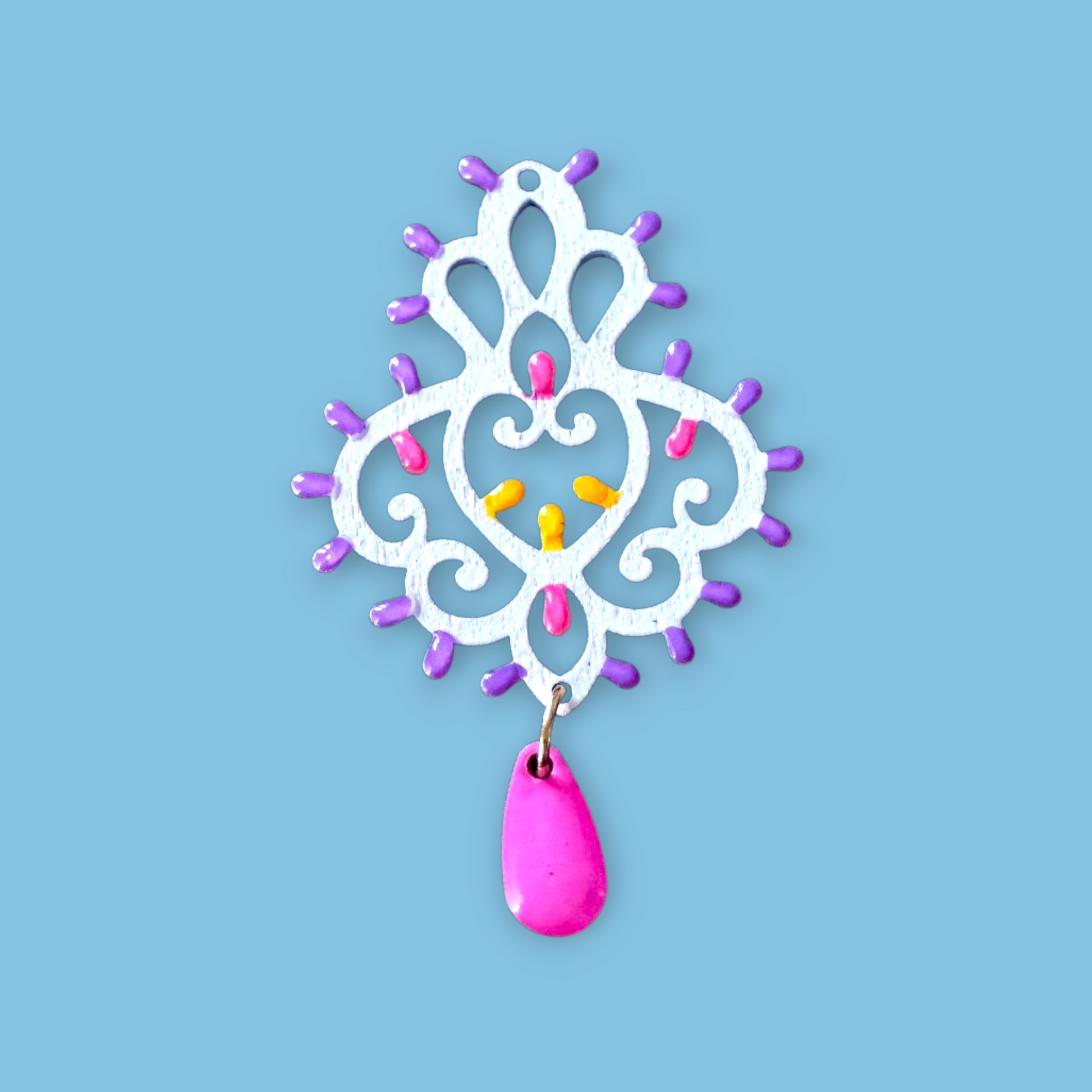 Il ciondolo disegnato in stile barocco (lunghezza 6 cm) realizzato interamente in legno multistrato da 3mm, verniciato e resinato a mano. Ultra leggero e resistente.