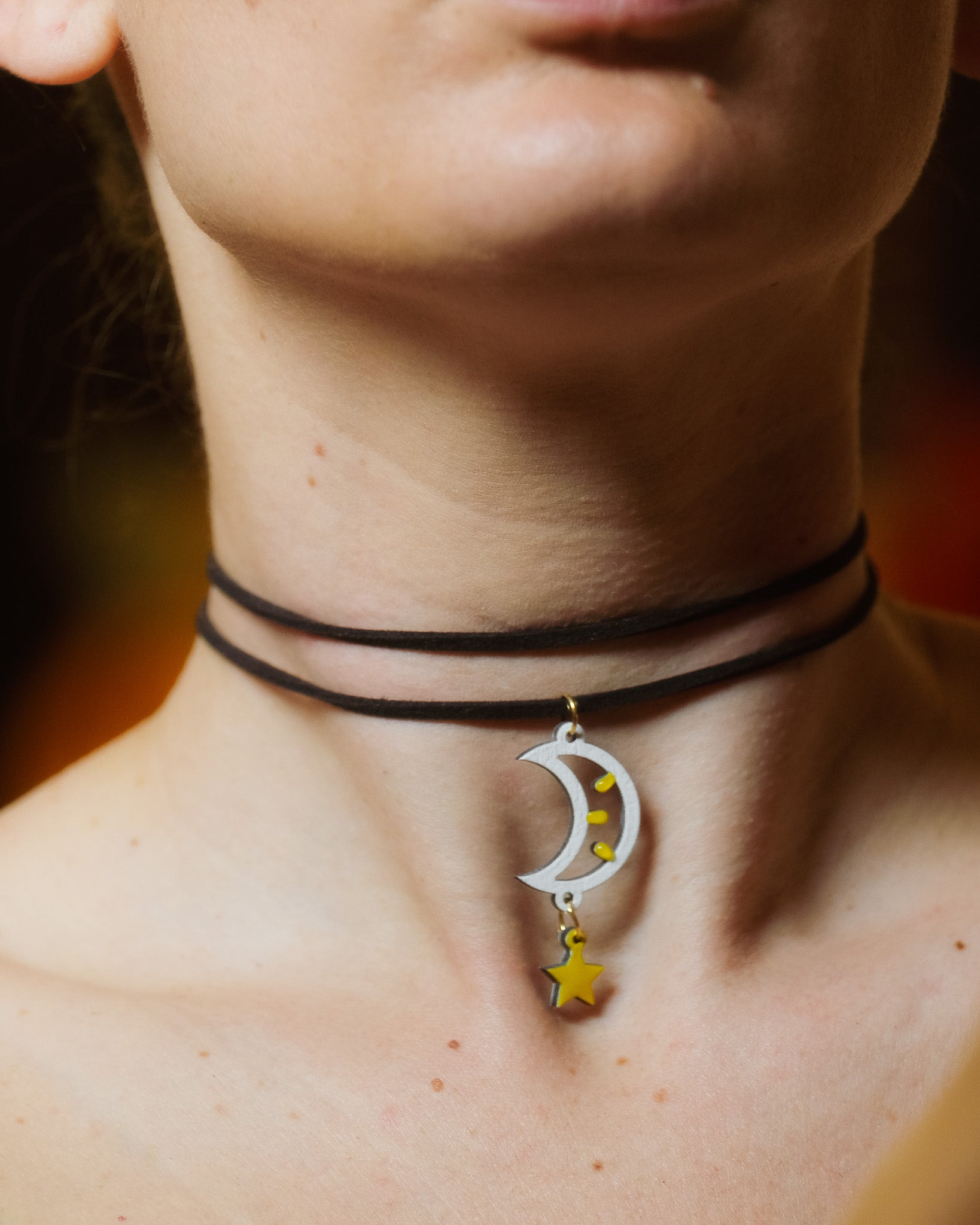 Collana choker artigianale con ciondolo in legno intagliato a forma di luminaria pugliese, dipinto a mano e rifinito con punte in resina lucida.