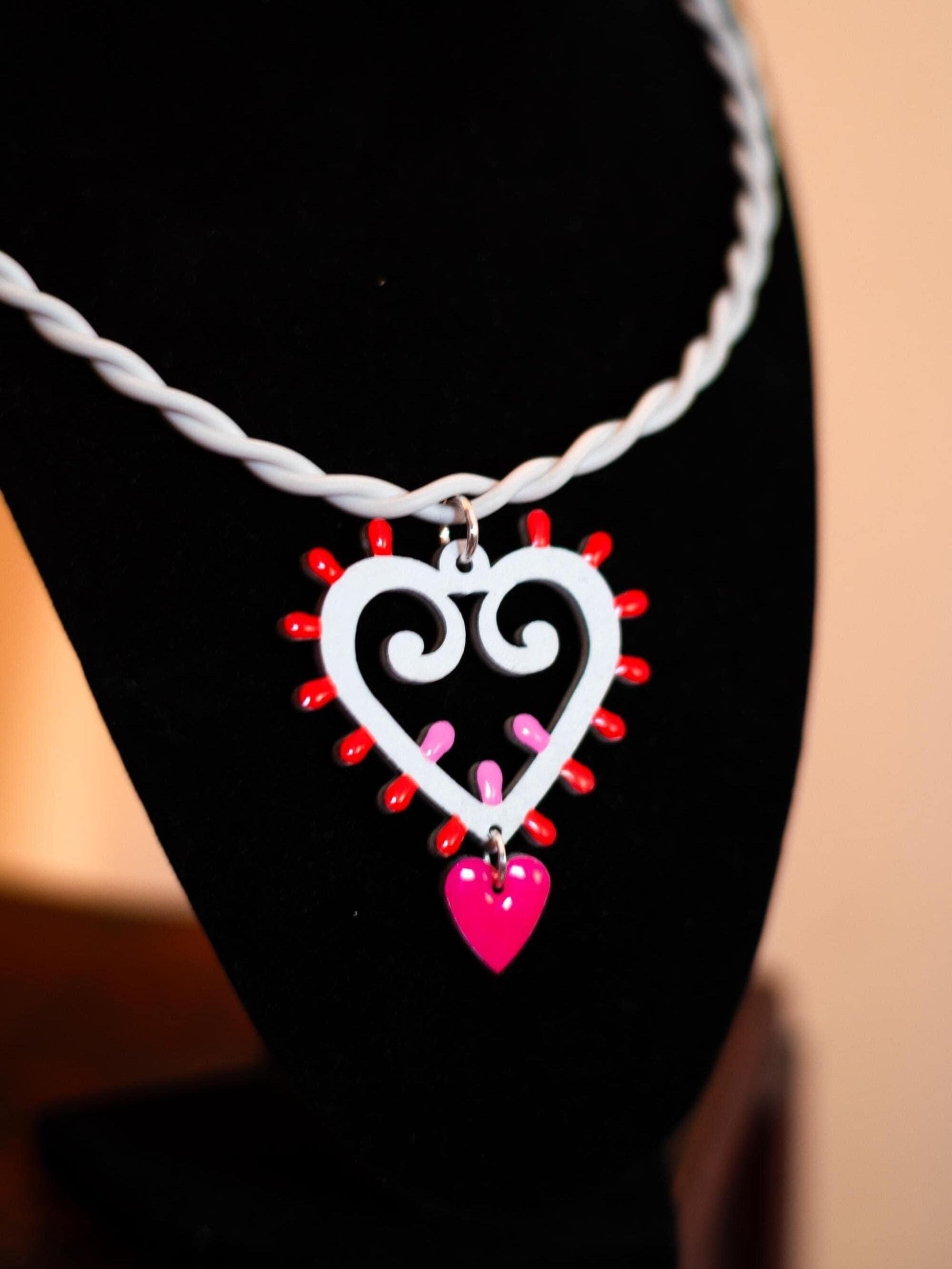 La collana è composta con il cavo elettrico intrecciato delle luminarie e con un ciondolo a forma di Cuore (diametro 6 cm) realizzato interamente in legno multistrato da 3mm, verniciato e resinato a mano. Ultra leggero e resistente. La chiusura semplificata a click è in acciaio inossidabile.