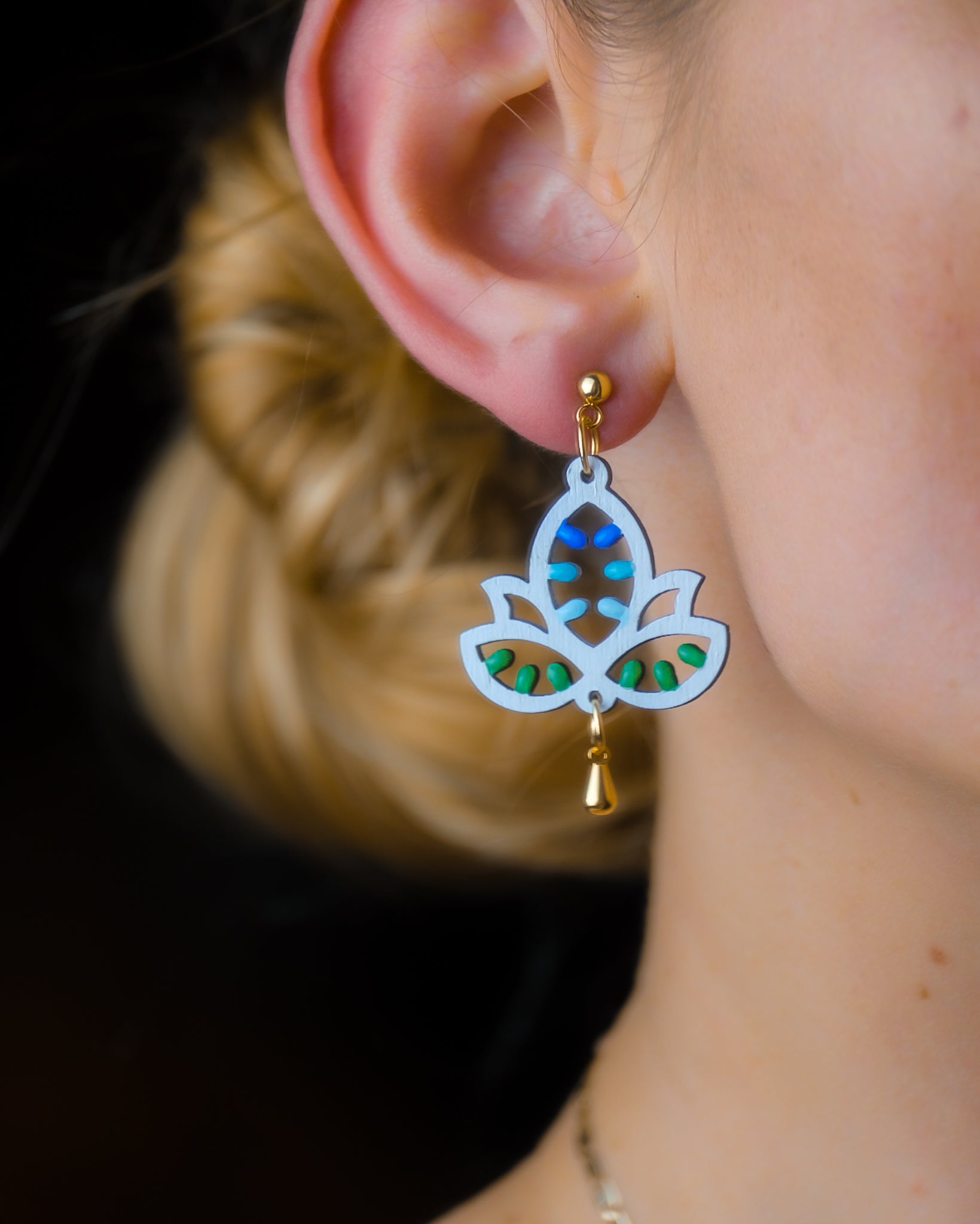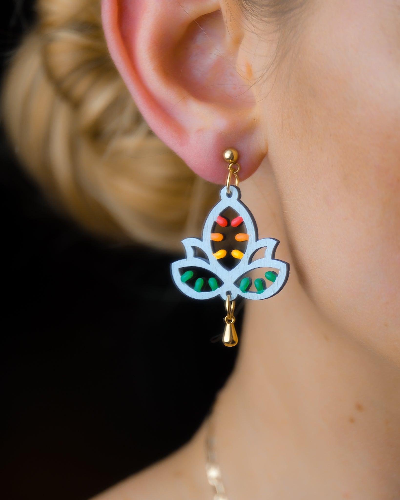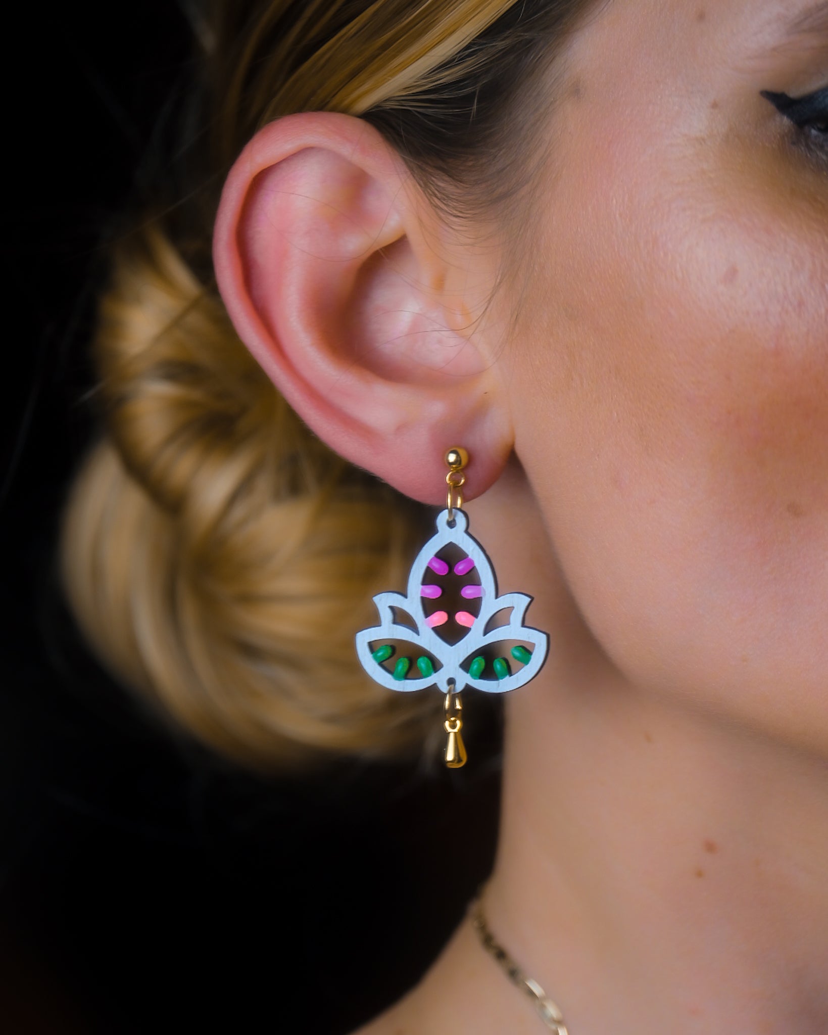 Questi orecchini celebrano la delicatezza dei fiori e l’incanto delle luminarie pugliesi, con un design che richiama la forma stilizzata di un giglio.