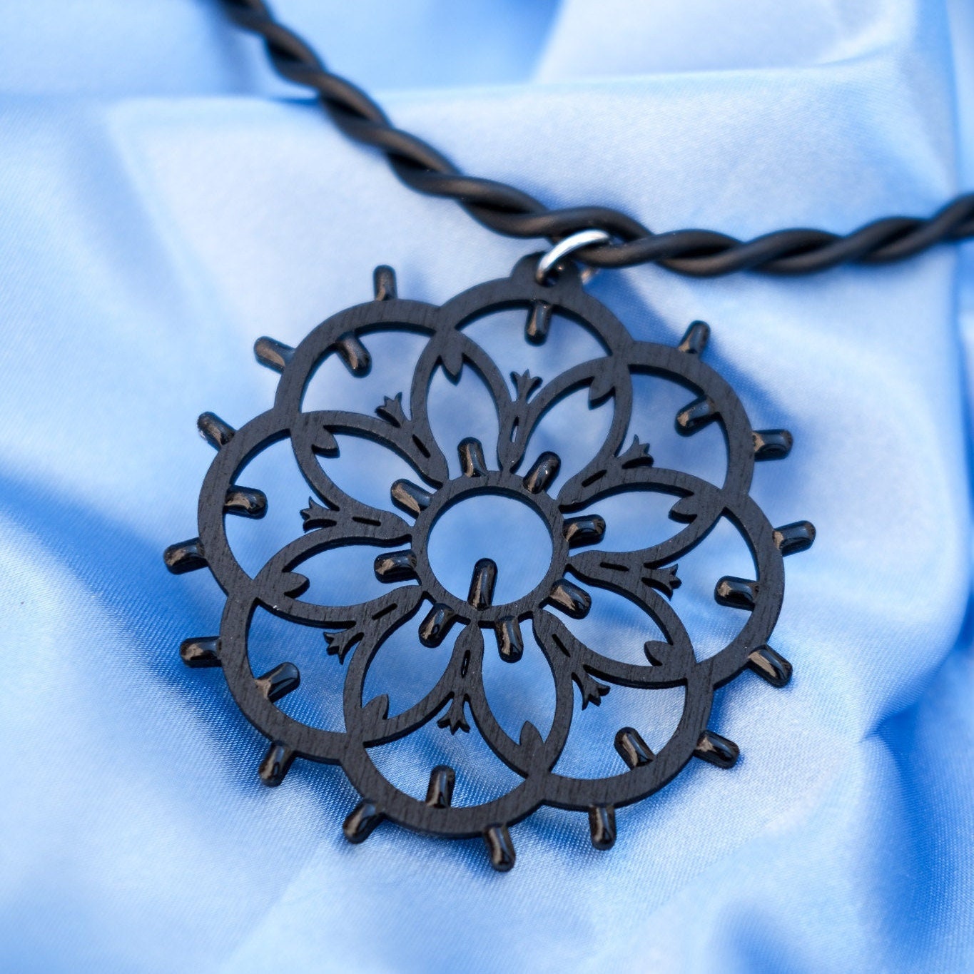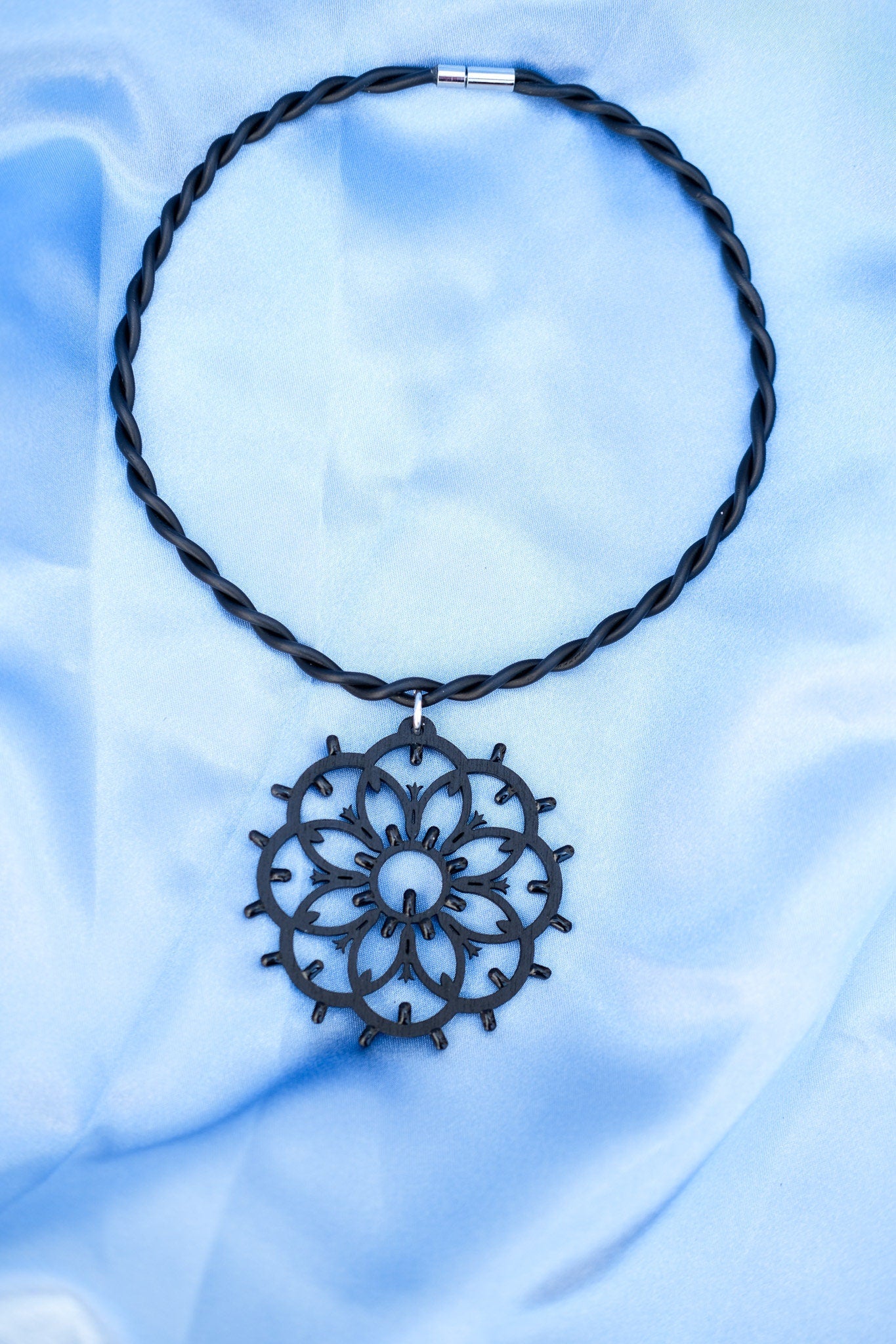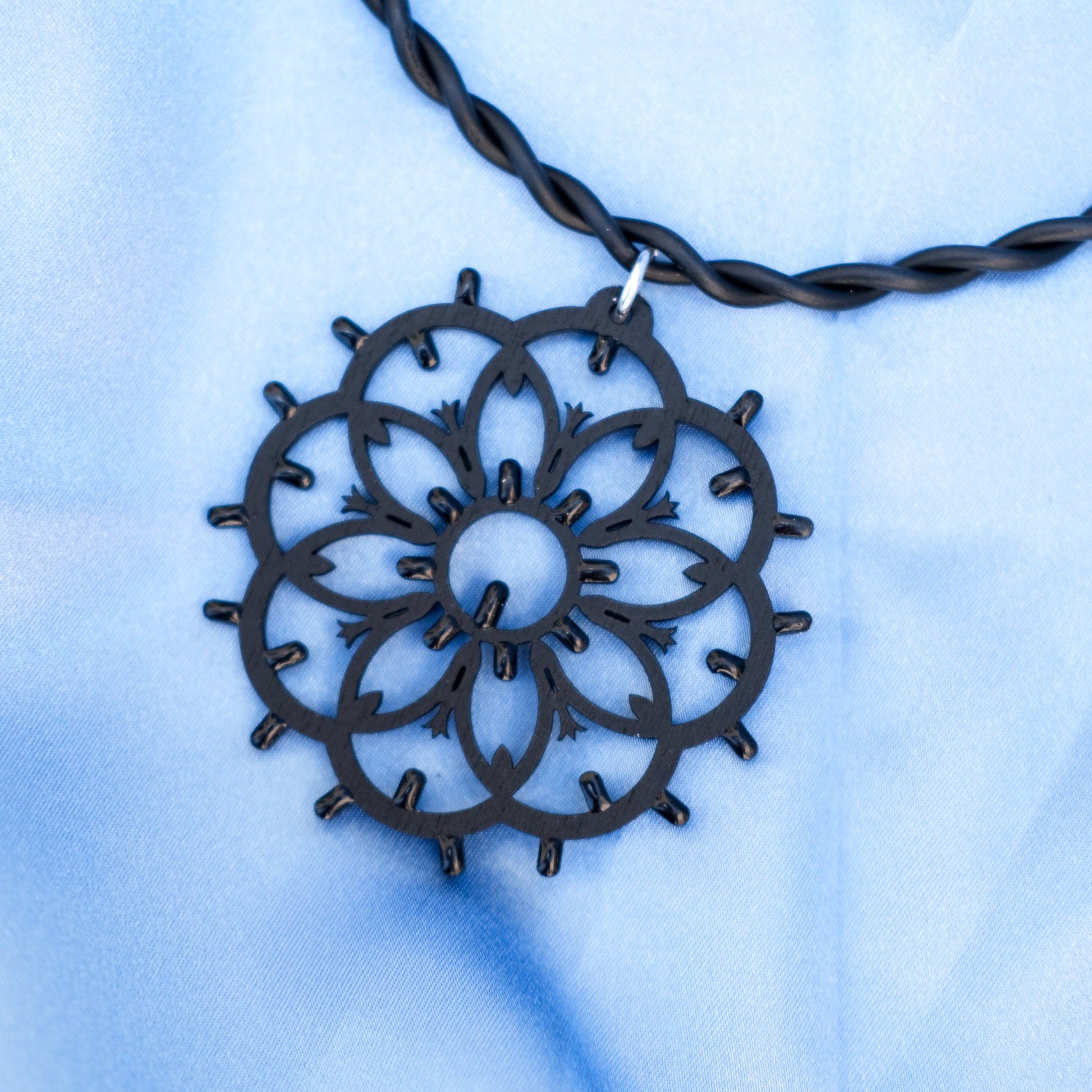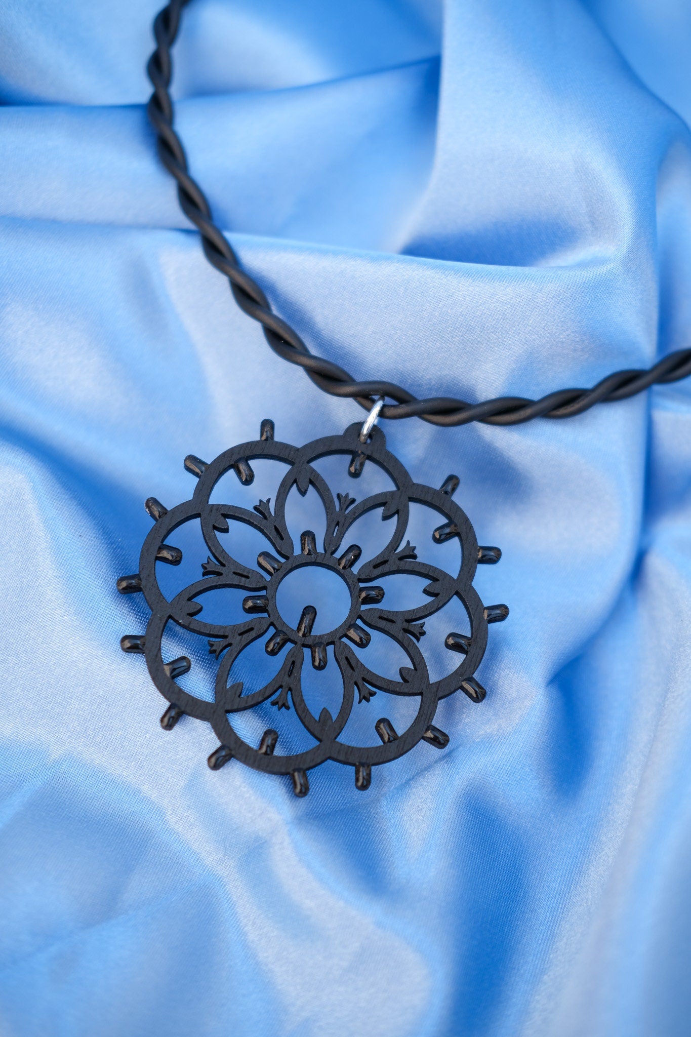 Il ciondolo a forma di Rosone completamente nero (diametro 7 cm) realizzato interamente in legno multistrato da 3mm, verniciato e resinato a mano. Ultra leggero e resistente.