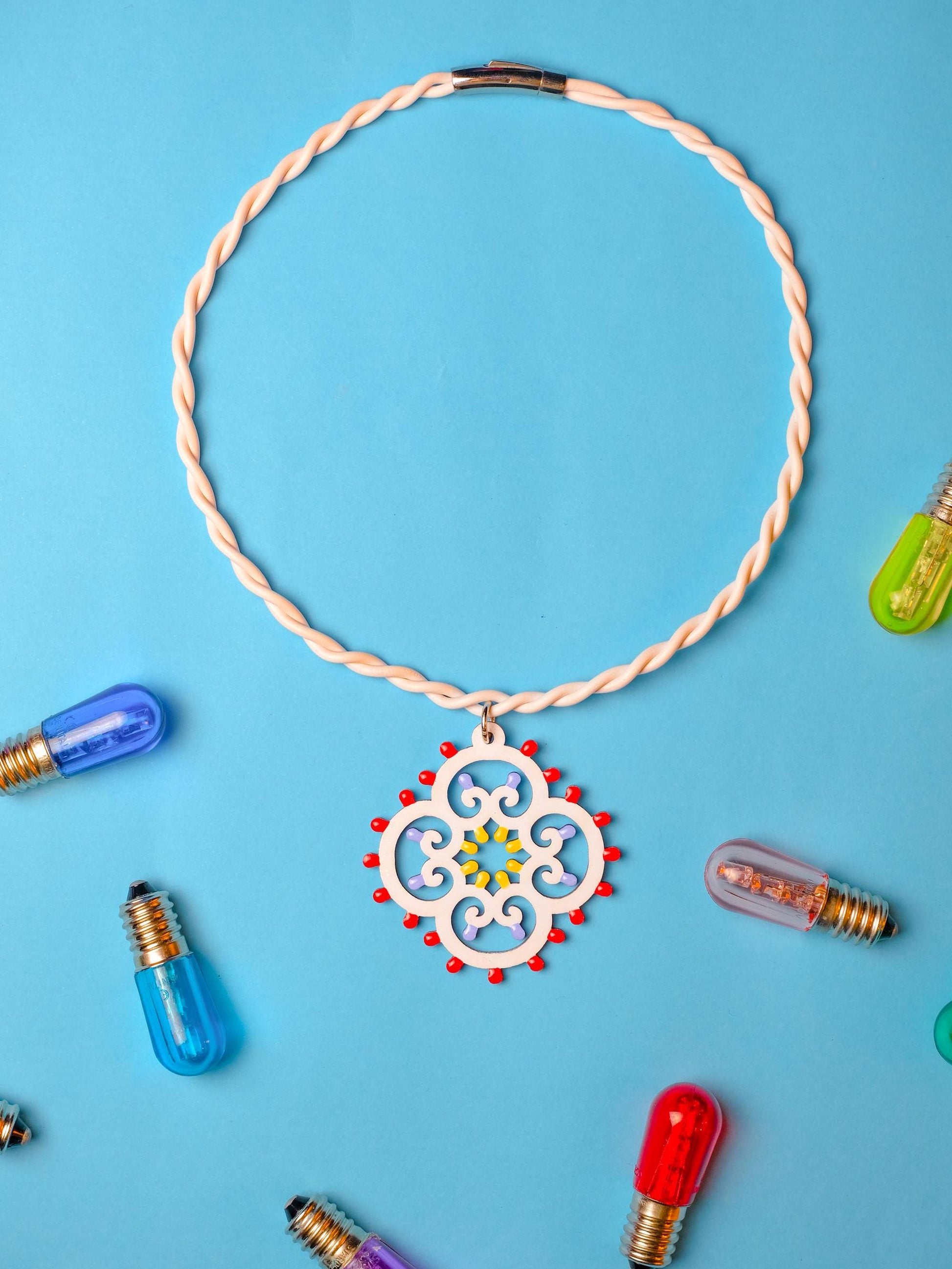 Una vera luminaria salentina da indossare: I nostri gioielli artigianali sono realizzati con modelli in scala delle tradizionali luminarie riprendendo i materiali originali: il cavo elettrico diventa collier, mentre i pendenti vengono realizzati in legno di pioppo, dipinti e resinati a mano.