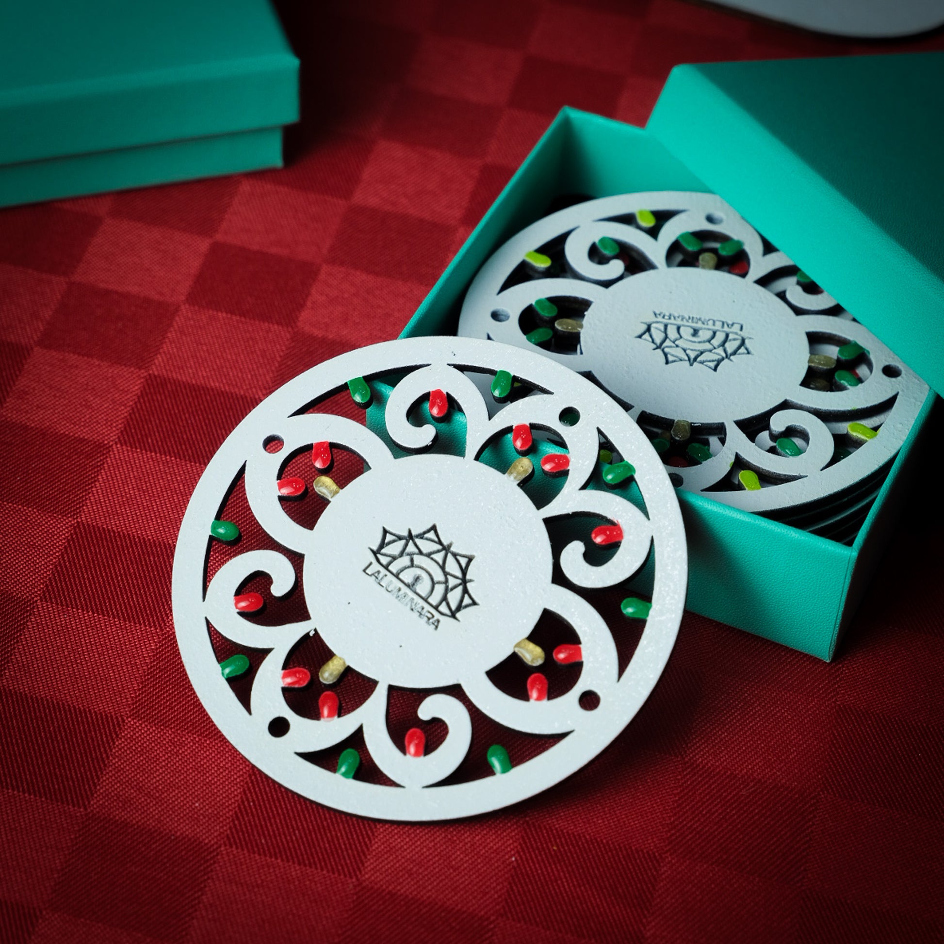 I nostri sottobicchieri, disponibili in set da 6 o da 12, riprendono le forme iconiche dei rosoni luminosi delle feste del Sud Italia.