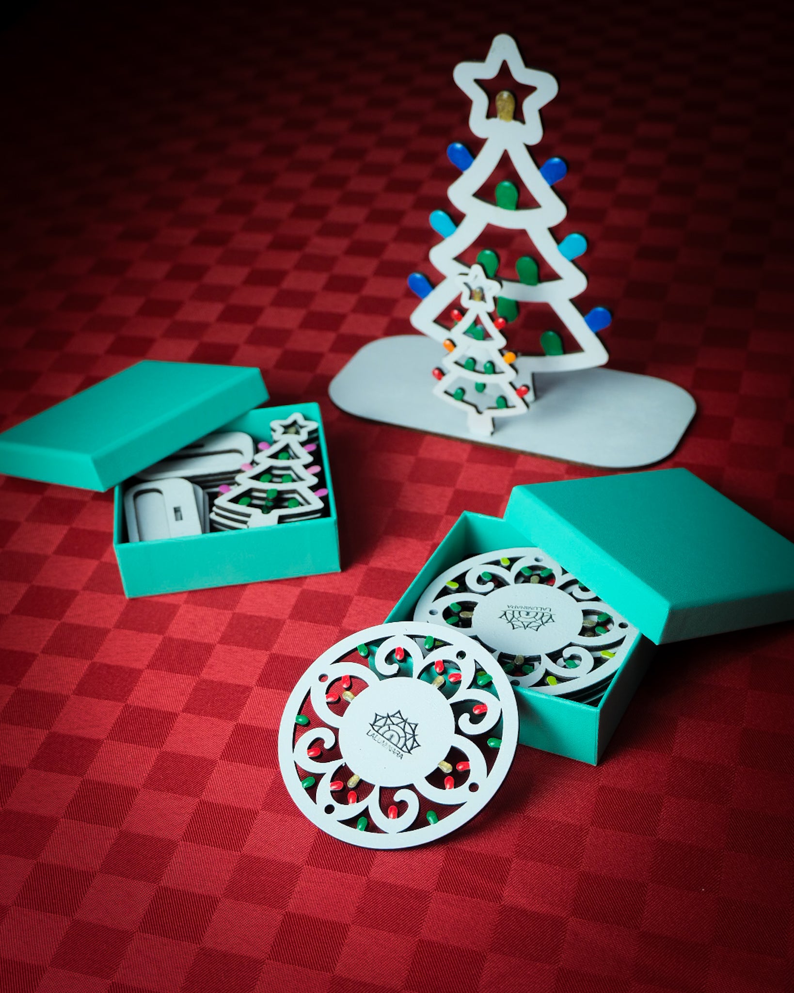1 Portatovaglioli “Albero Luminoso” da centrotavola (altezza ~18 cm, due alberi a incastro)